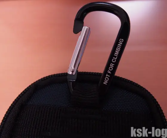 ケースのつくりはしっかりしていて、背面にカラビナとベルクロがついていて、リュックへの固定などもできるようになっていました。