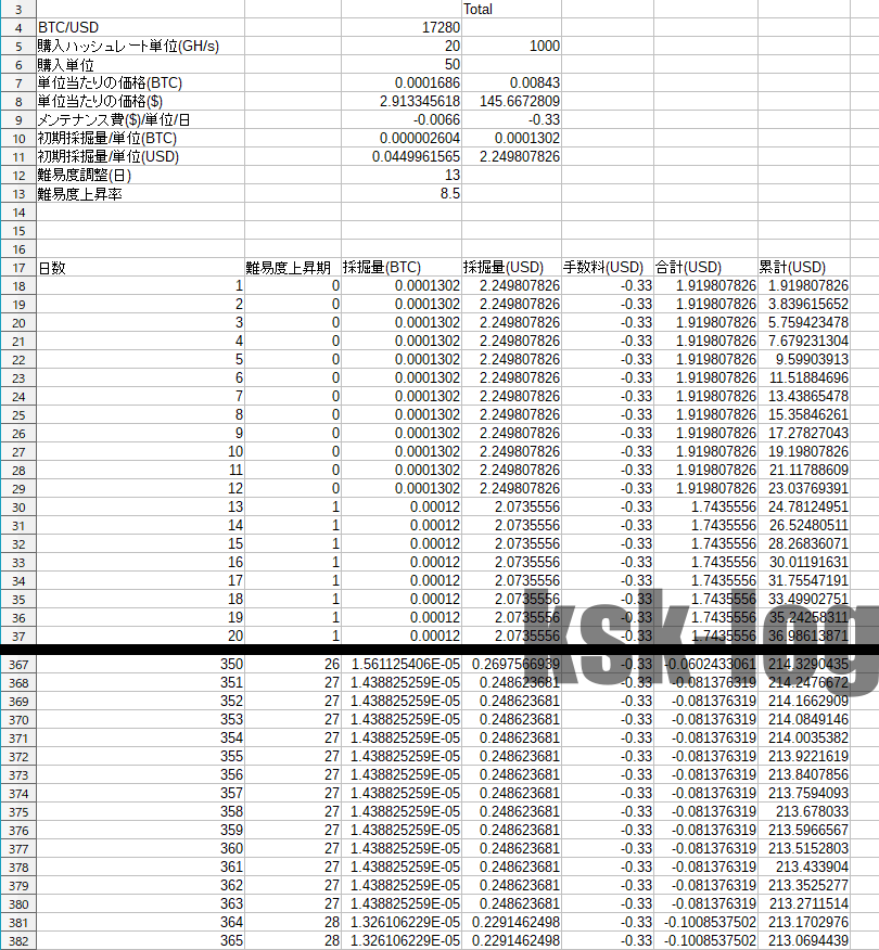 これで難易度上昇率と難易度調整日数を考慮して一定期間経過後の採掘量が計算できます。