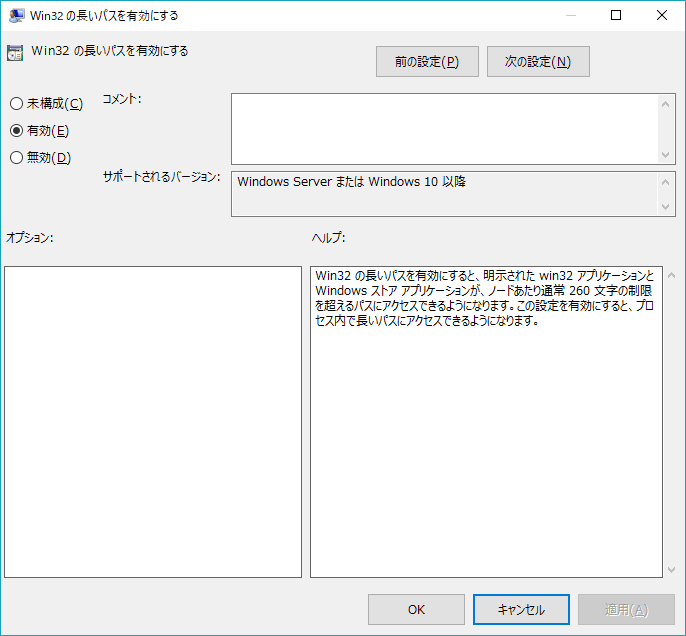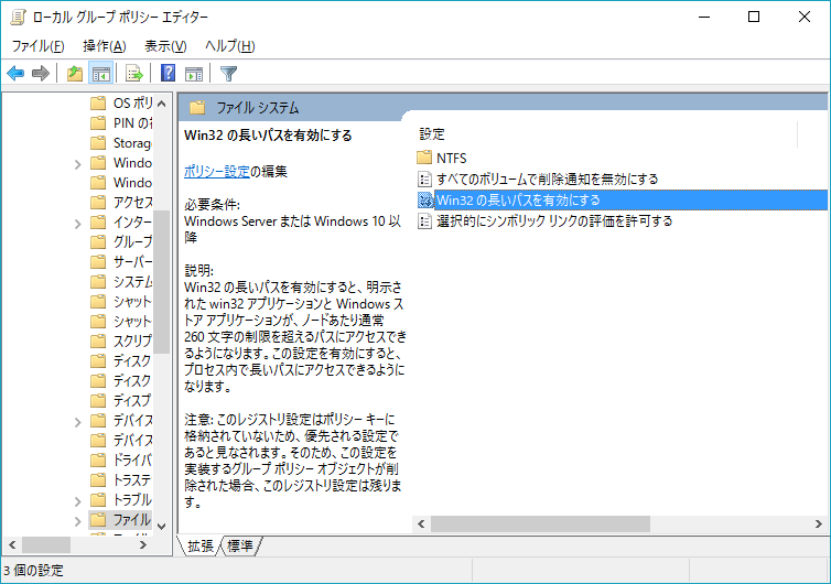 新たなウィンドウが開くので、Win32の長いパスを有効にするで設定を有効に切り替えます。