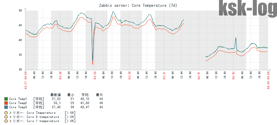 増設前はCPU温度は45℃前後だったのが、交換後は37℃前後とかなり下がっています。4/2に温度が一瞬上がっているのはClamAVの定期スキャンによるものでしょう。