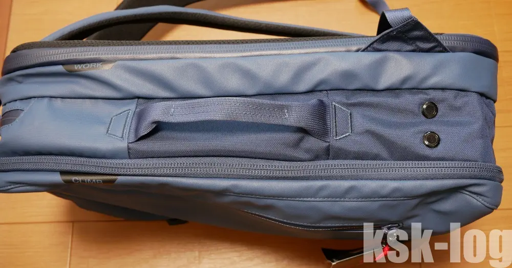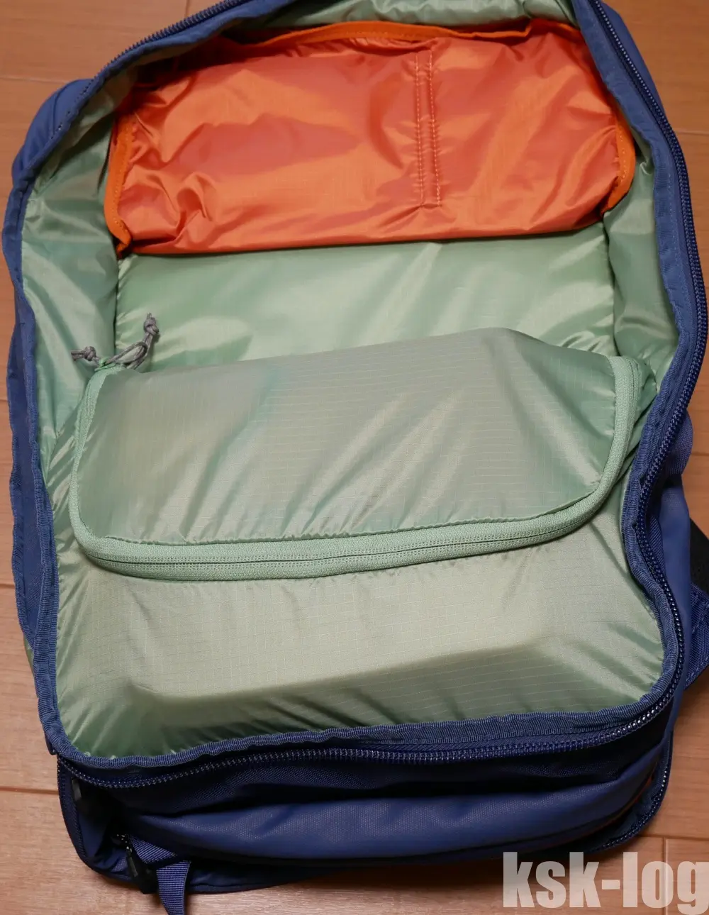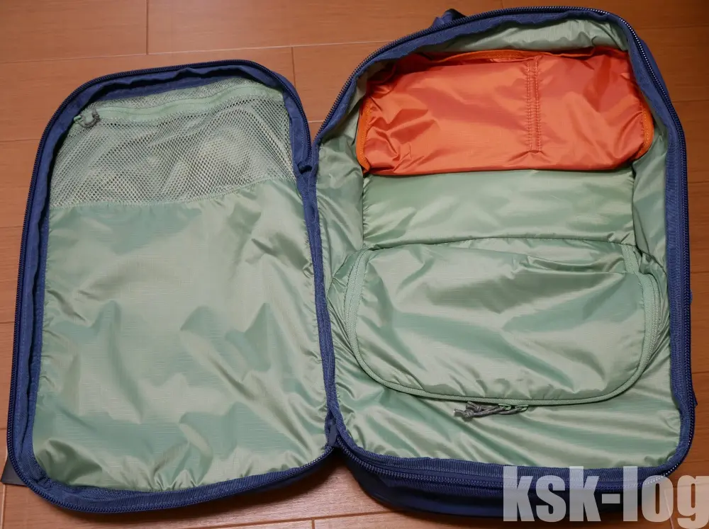 上部のオレンジ色の部分は次に説明する貴重品コンパートメントで、下部のポケットはシューズコンパートメントとなっています。
