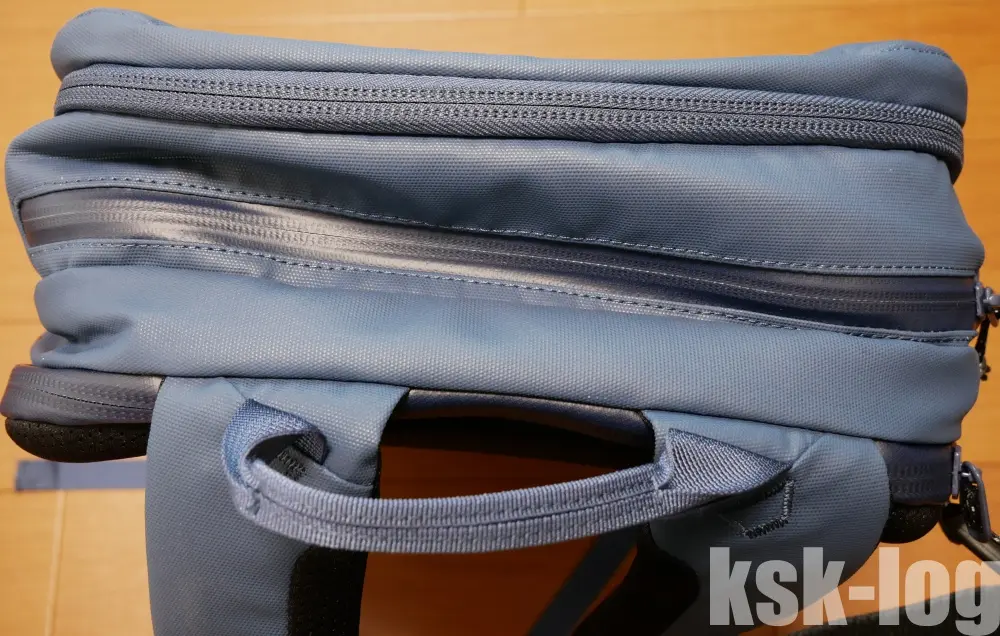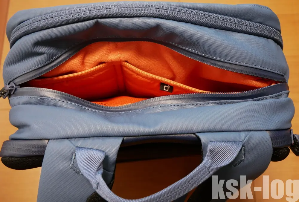 2気室の背中側(オレンジ)はワークコンパートメントとなっており、2つの止水ジッパーで開閉が可能です。