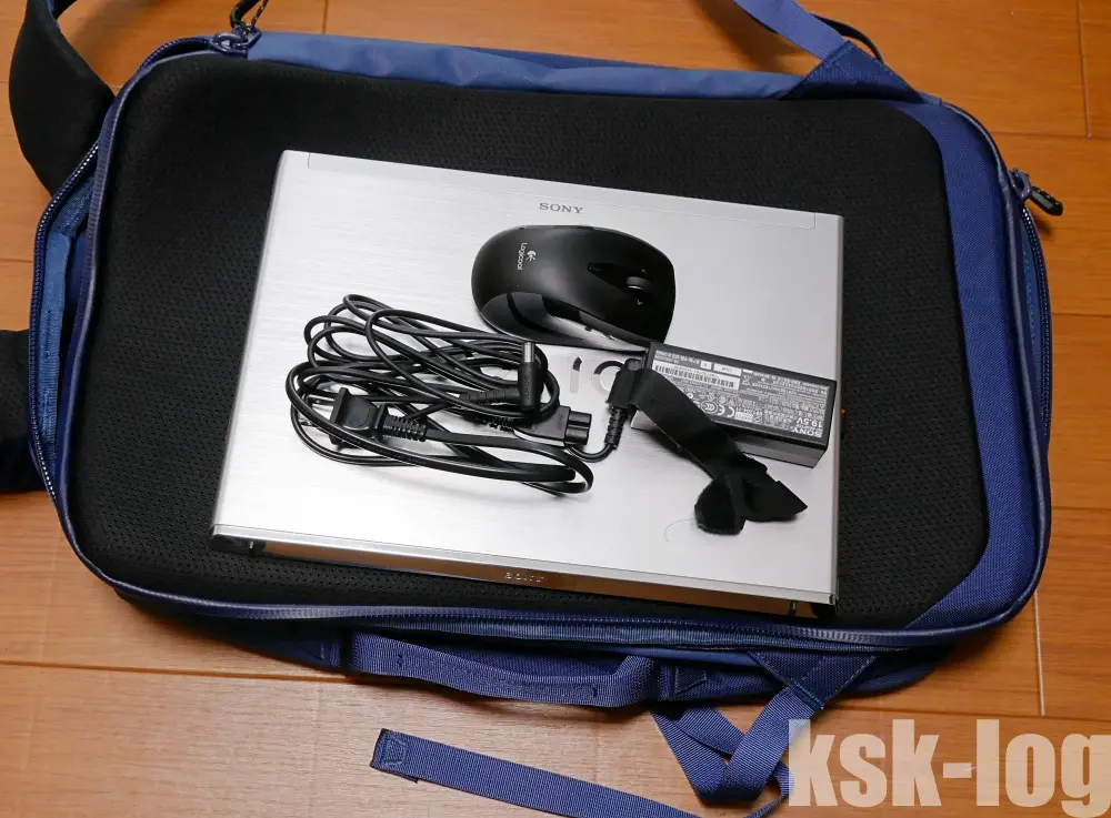 手持ちのノートパソコン(VaioT11, 11.9インチ)を試しに収納してみました。