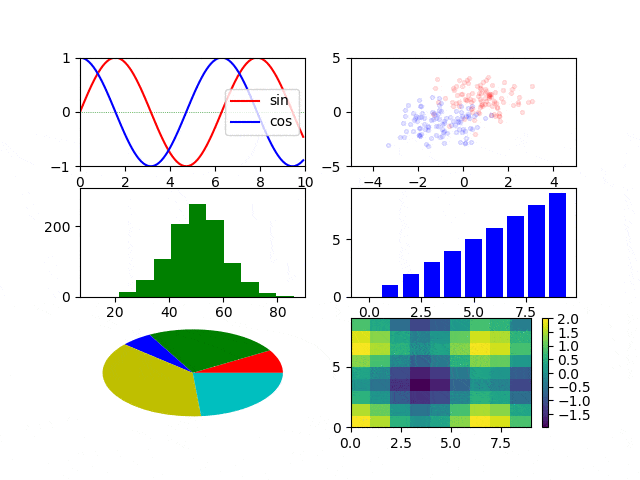 折れ線、散布図、棒、ヒストグラム、円、ヒートマップなど主要なグラフは上記のプログラムで一通り示せることを確認しました。
