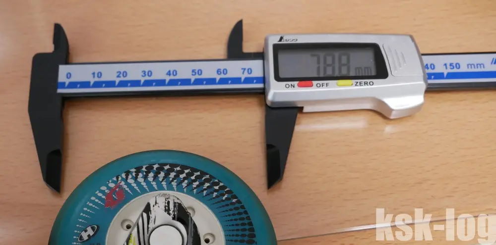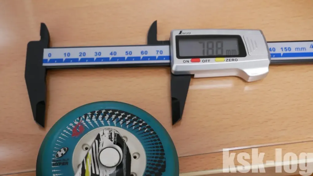 実際に、現在利用しているウィールであるHyper ConcreteG+ 80mm/84Aの径を測定してみました。