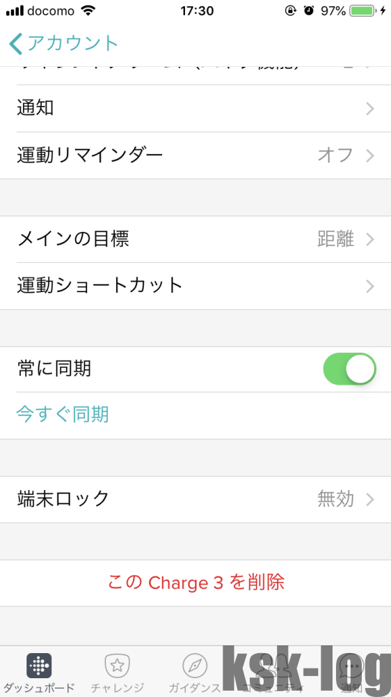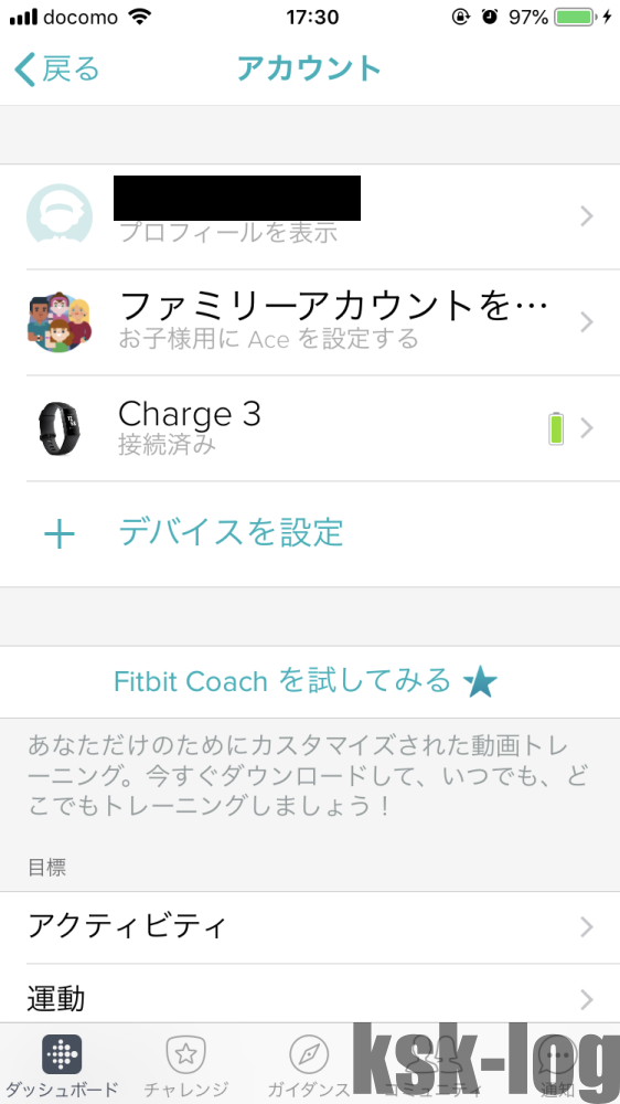 さらに、「アカウント」→「端末名(私ならCharge3)」からメインの目標を距離に設定します。