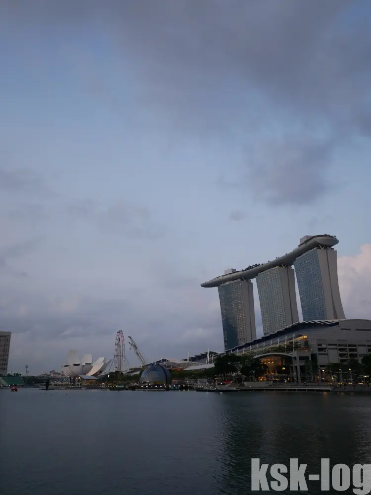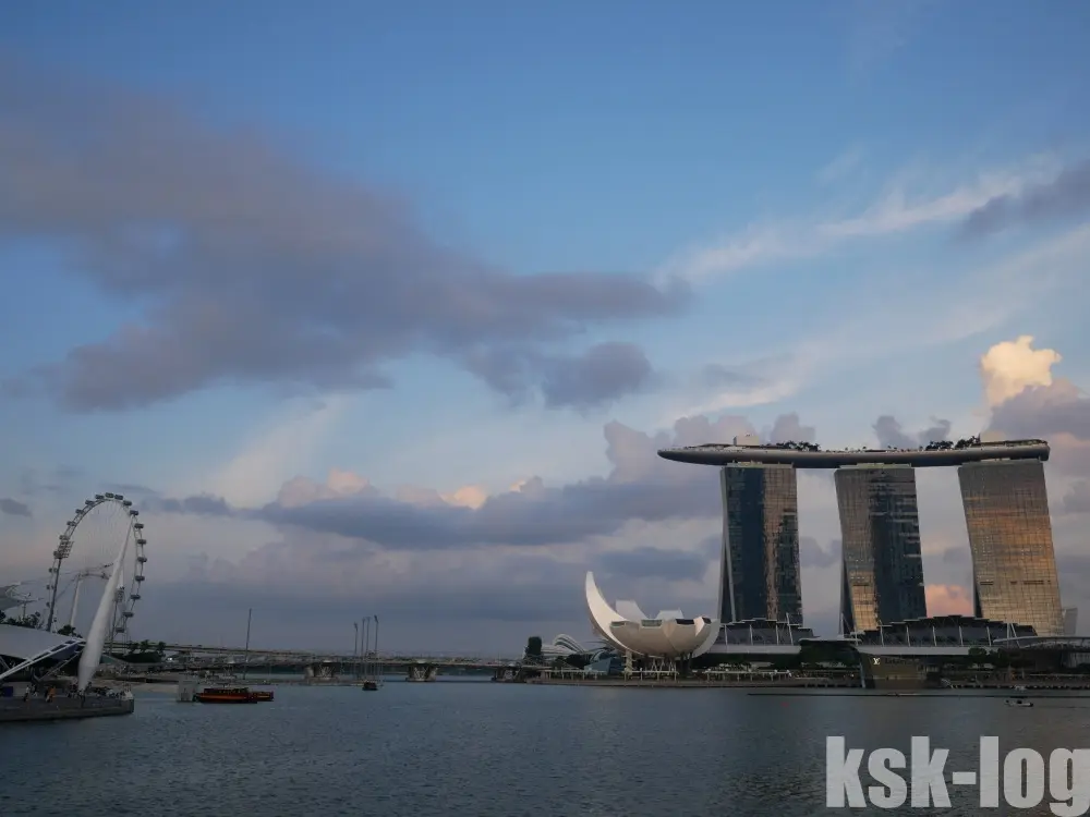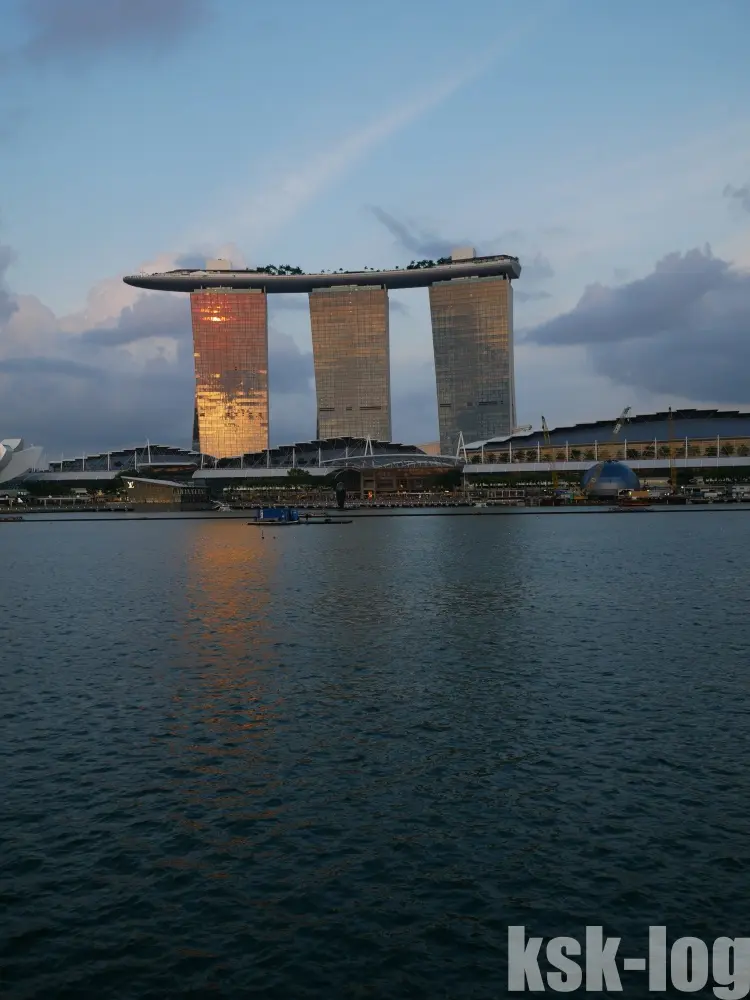 夕日がマリーナベイサンズと港に反射して、なかなか趣深いですね。