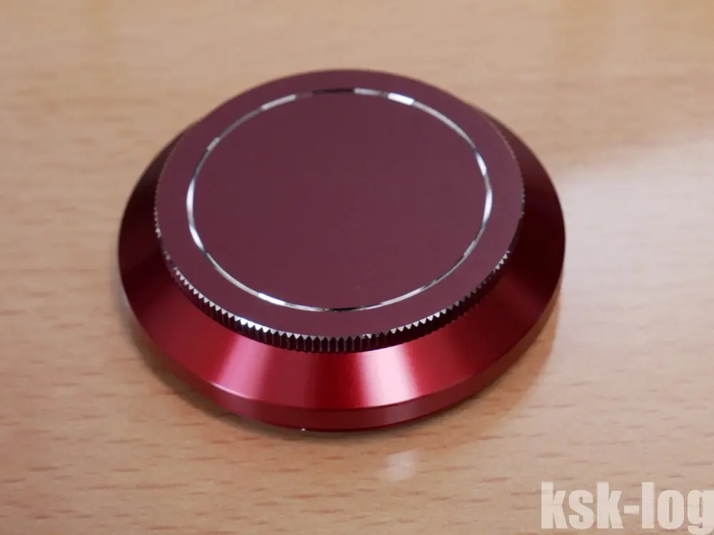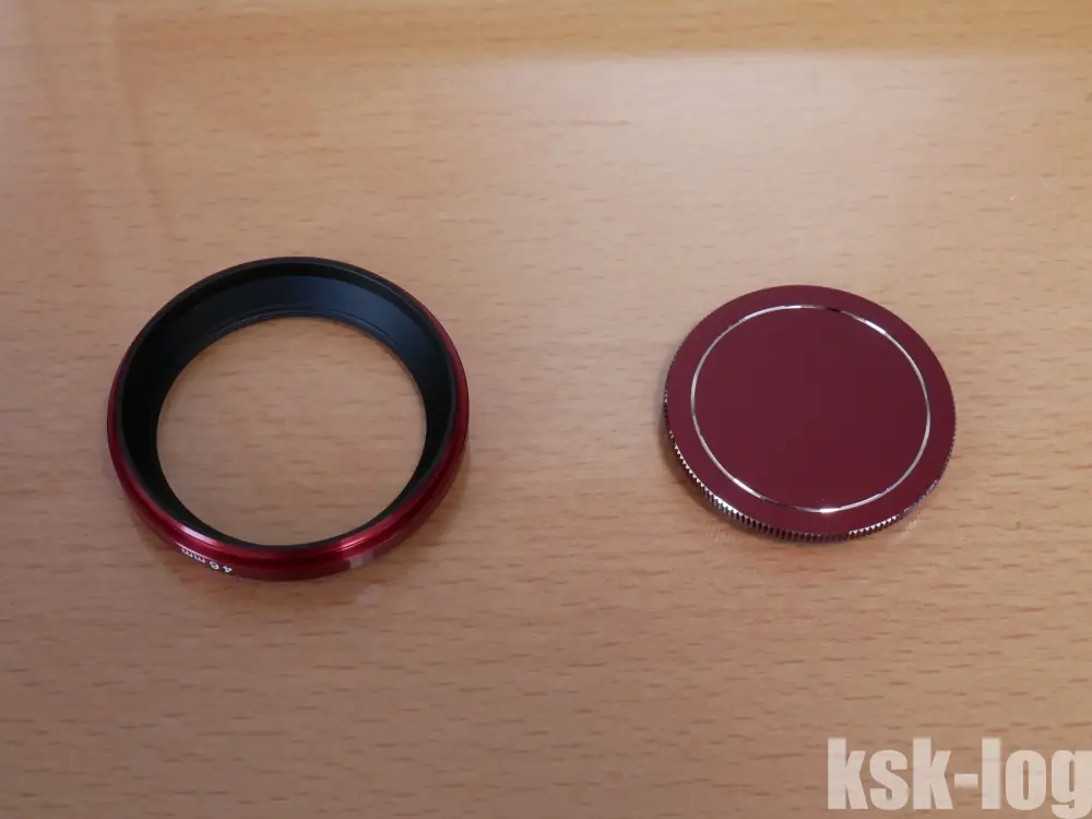 レンズフードとキャップを組み合わせてみるとこんな感じになります。 正直フードとキャップで色味が違うので微妙な感じがしますね。 フード側がレッド、キャップ側がワインレッドという感じで、これだと正直セット販売という形では販売してほしくなかったというのが素直な感想です。てっきり同色かと思っていました。