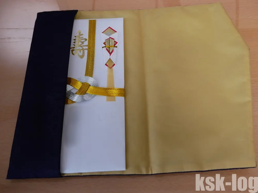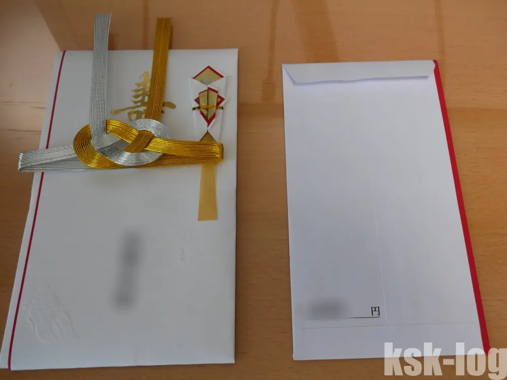 祝儀袋はマルアイ キ-19というものを利用しました。 表が少し滲んでしまい、メモ帳に練習したほどにはうまくいかなかったです。 これは筆ペンのインクというより祝儀袋そのものの問題でしょう。