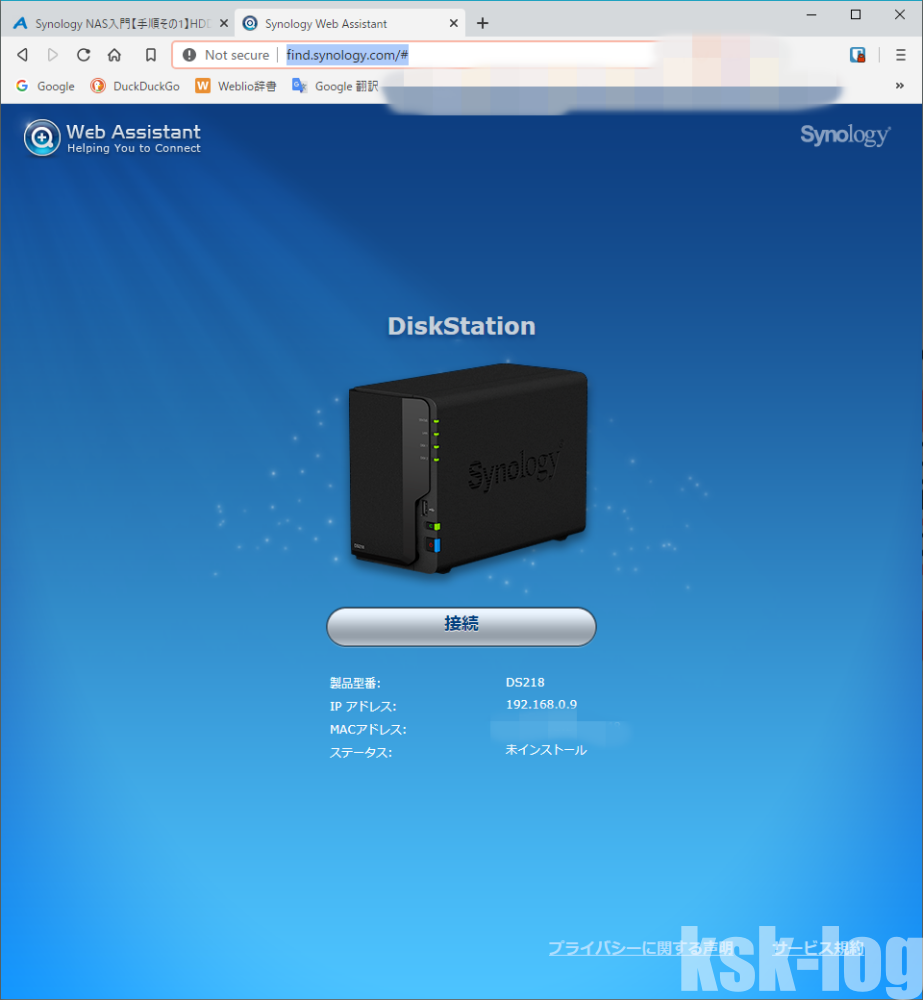電源投入後、find.synology.com↗アクセスするとLAN上のNASを探すことができます。
