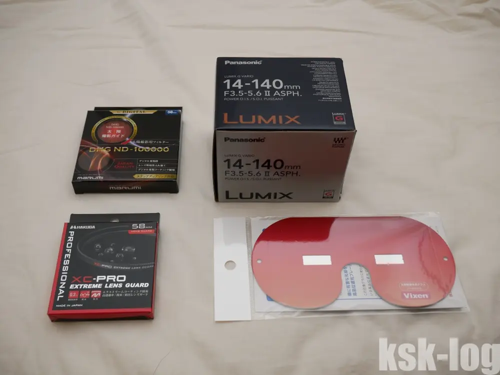 14-140mm、NDフィルタ、保護フィルタ、日食グラスの4点です。