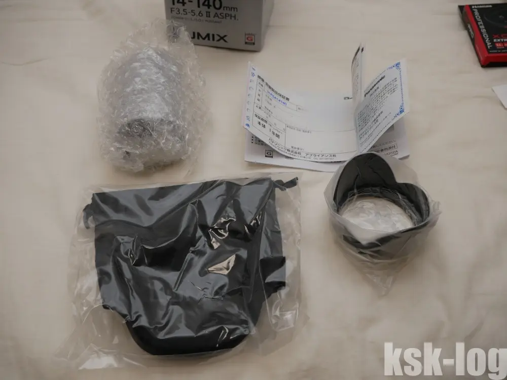 保証書、説明書、本体、ポーチ、レンズフードが同梱されています。