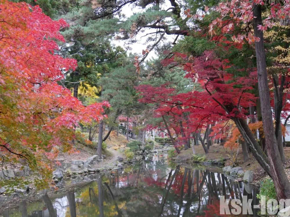 大きな池が特徴の場所で、紅葉との組み合わせが綺麗な場所です。