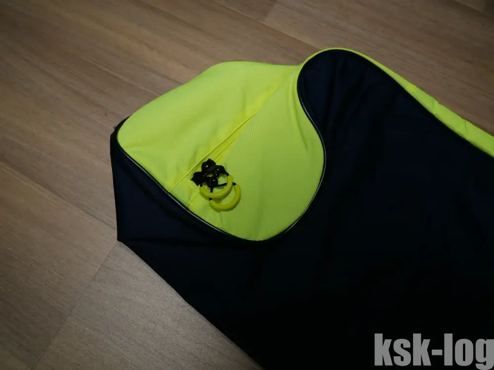上下(写真では左右)のコンプレッションベルトを締めると以下のようになります。バッグ下部はベルトをそのまま、上部は1周させて締めています。バックルはかっちりとは嵌らず、ヌルっと嵌る感じでした。