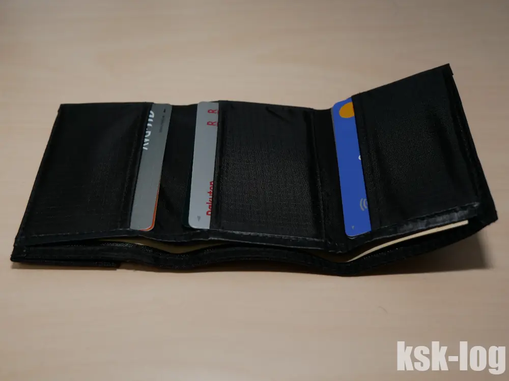 また、革財布でもあるので旅行時にポケットに入れておくと汗を吸ってしまってよろしくないなので、化繊系の雑に使える財布も別途ほしくなっていました。
