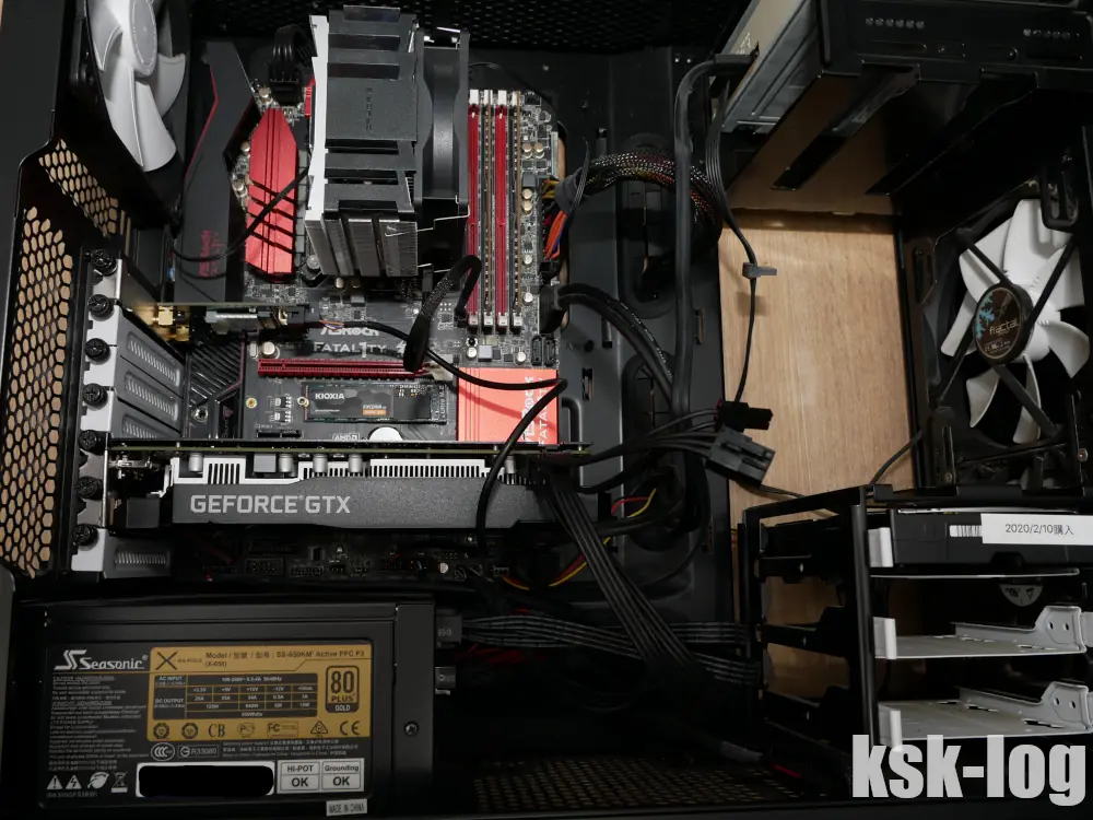 排熱考慮してGPUやBluetoothボードの位置を変えてみましたが、結局GPUの排熱にあたりそうですね。このマザボにはM.2接続は1か所しかないのでどうしようもないですが。