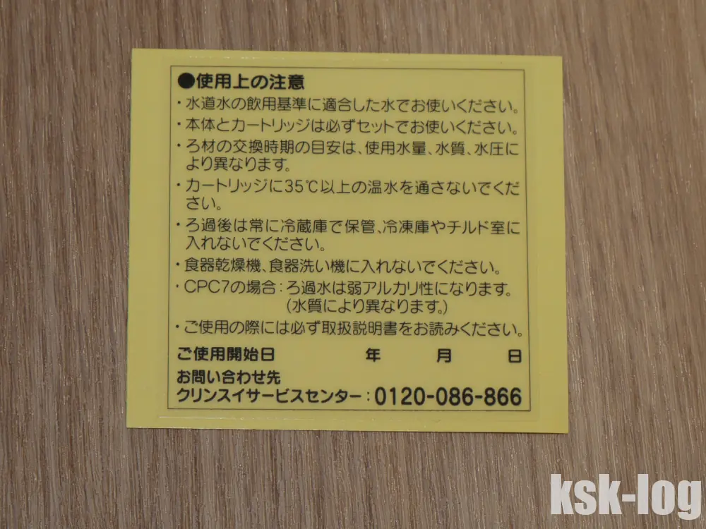 ステッカーには使用上の注意と問合せ先の記載がされており、利用開始日を記入できるようになっています。こちらには記入の上で浄水ポットの底に貼っておきます。