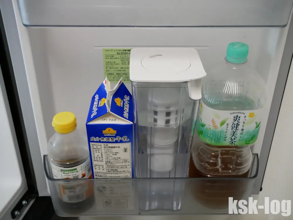 152Lサイズの冷蔵庫であるSharp SJ-D15Hの扉ポケットに入れてみると以下の写真のようになります。2Lペットボトルよりは省スペースな印象です。