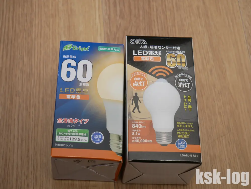 これに対してコストがお手頃かつ5年保証と期間も長いオーム電機の密閉対応のLED電球と、人感センサー付きLED電球を購入することにしました。