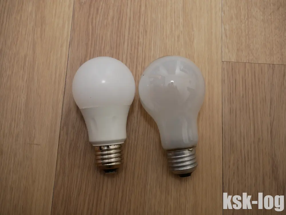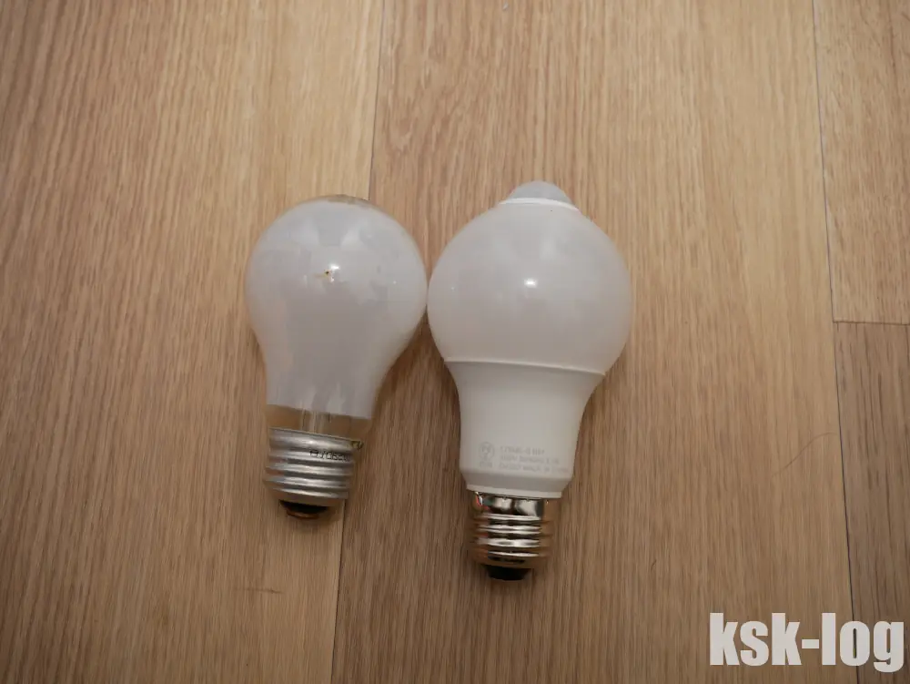 前に取り付けてあった白熱電球(左)と並べてみると形状が大分違います。根元の太さが増していて、高さも大きくなっていることがわかります。人感センサーがあるためカバーをつけることはできず、ほとんどのケースで問題はないのでしょうが、環境によっては干渉しうることもあるかもしれません。