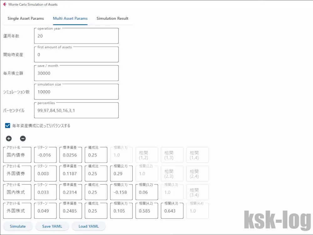 そのため、実際に自分でプログラムを書いて相関を持つアセットを対象に資産推移シミュレーションが行えるツールを作成することにしました。