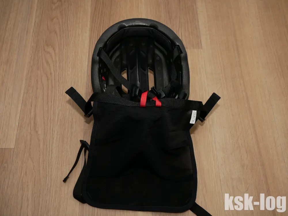 裏側に赤い留め紐があり、ここにヘルメットの顎ひもを掛ける形になります。