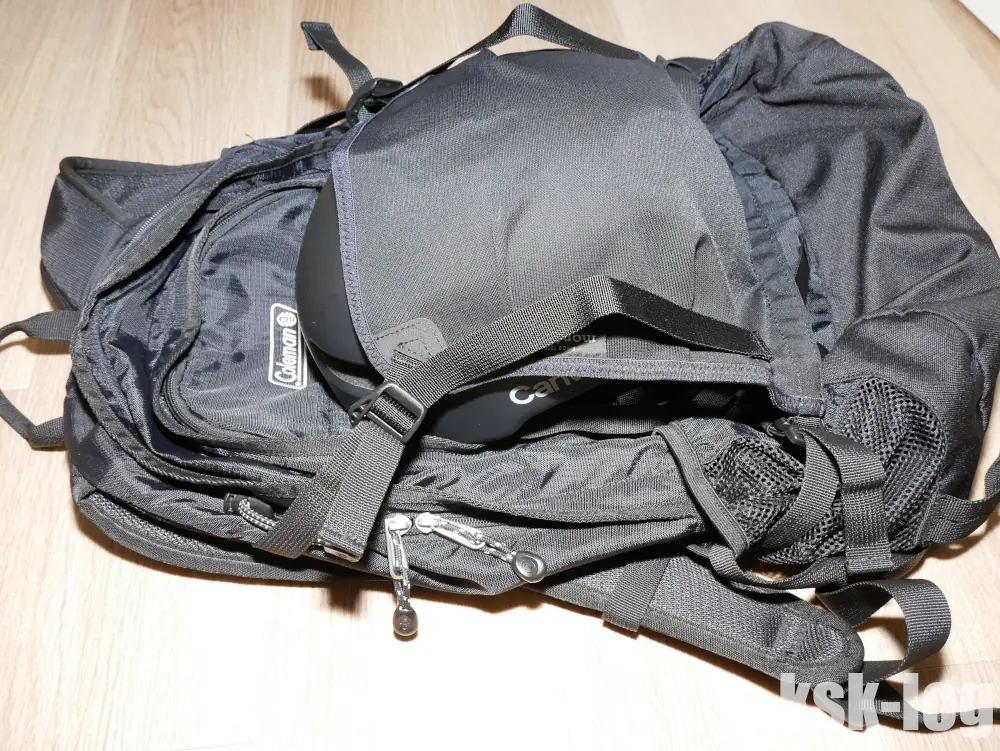 コールマンのWalker33に一通りの用具を入れてみます。入れてみるのはブーツ、プロテクター、ヘルメット、折り畳み椅子、サングラスになります。
