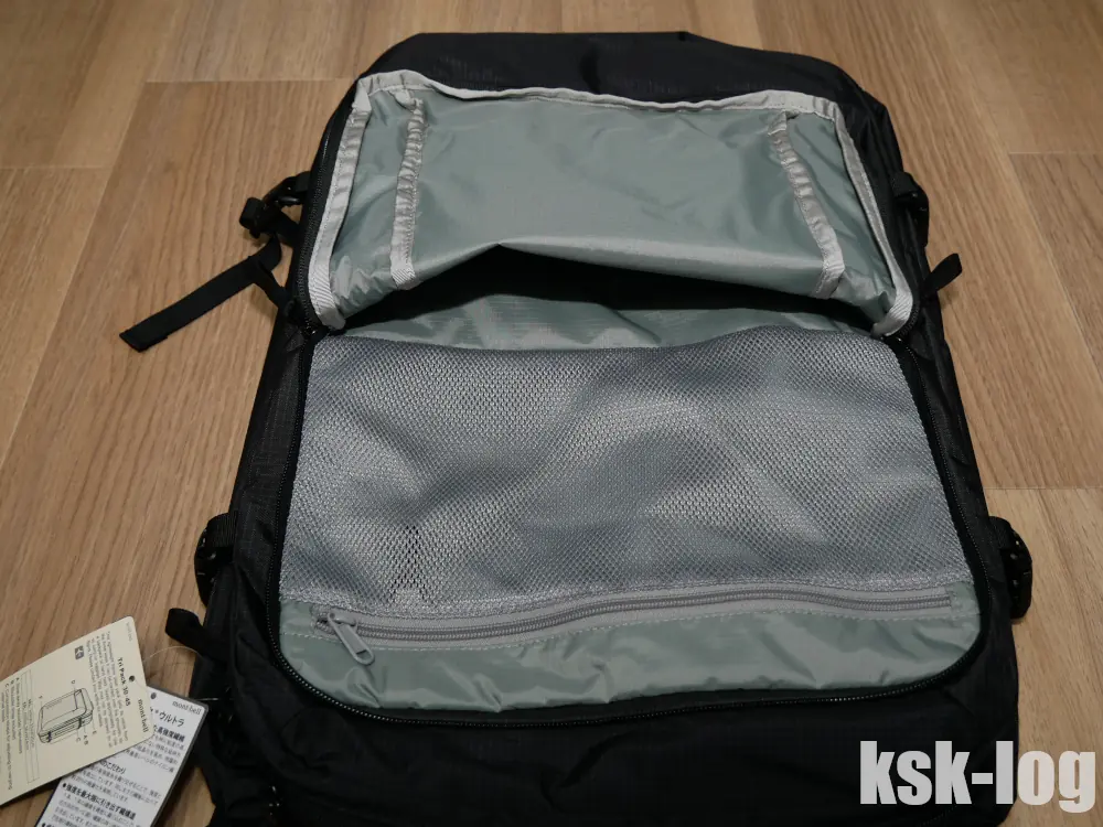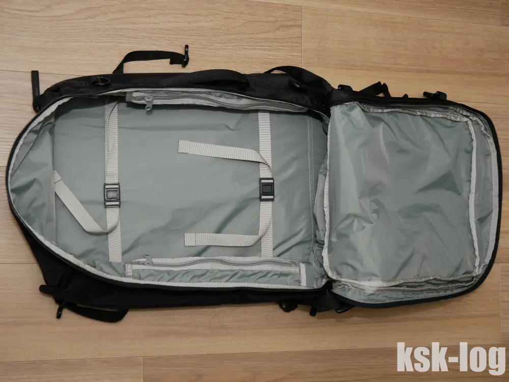 メイン部分の収納はかなり容量があり、45Lのほとんどを占めているものと思われます。 ただ、上部のオープンだけでも通常の荷物の出し入れは十分そうで、大荷物を入れるときにはフルオープンする使い分けになりそうです。