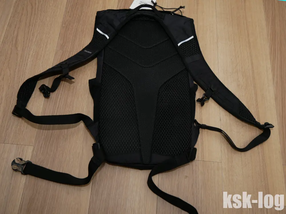 背面は以下のような感じで、ショルダーベルト、チェストストラップ、ウエストストラップも非常に薄いシンプルなものであることがわかります。