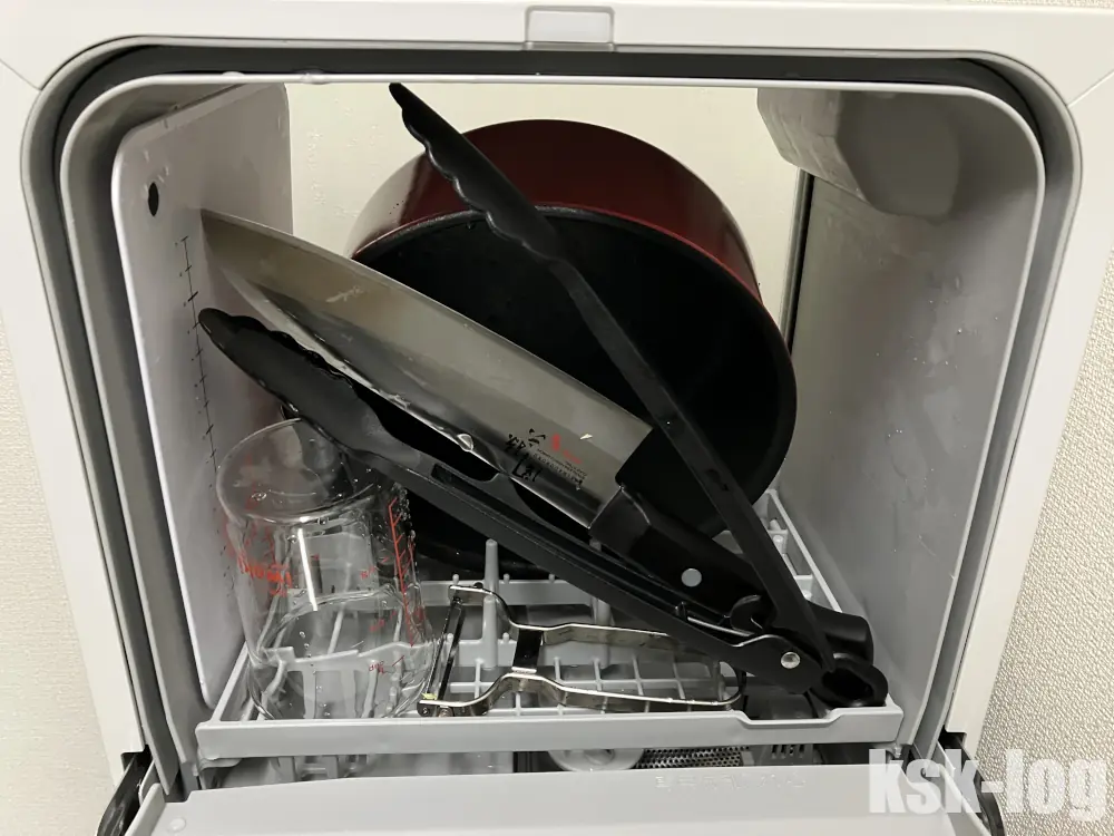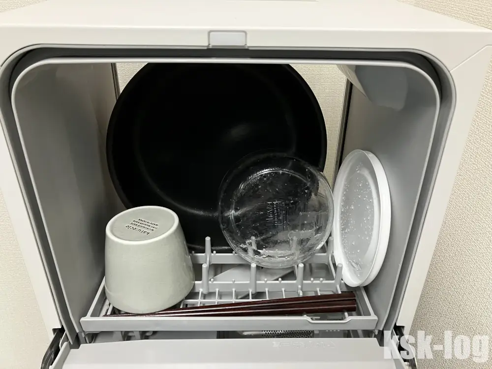 洗ってみた感想としては、20cmフライパンは問題なく洗えているようでした。一方でその8cmという深さのせいか、18cm鍋は大皿エリアにおいても食器エリアにおいても、水流が底まであまり届いていないように見えます。