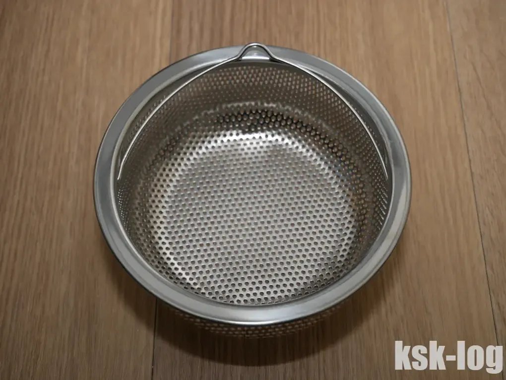 購入したのは和平フレイズのステンレス浅型ストレーナーのSUI-6059↗になります。パンチング加工がされており、手入れの際に凹凸に悩まされることが少なそうなこと、取っ手があり取り出しやすそうなこと、お値段が手ごろであったことが選択理由になります。