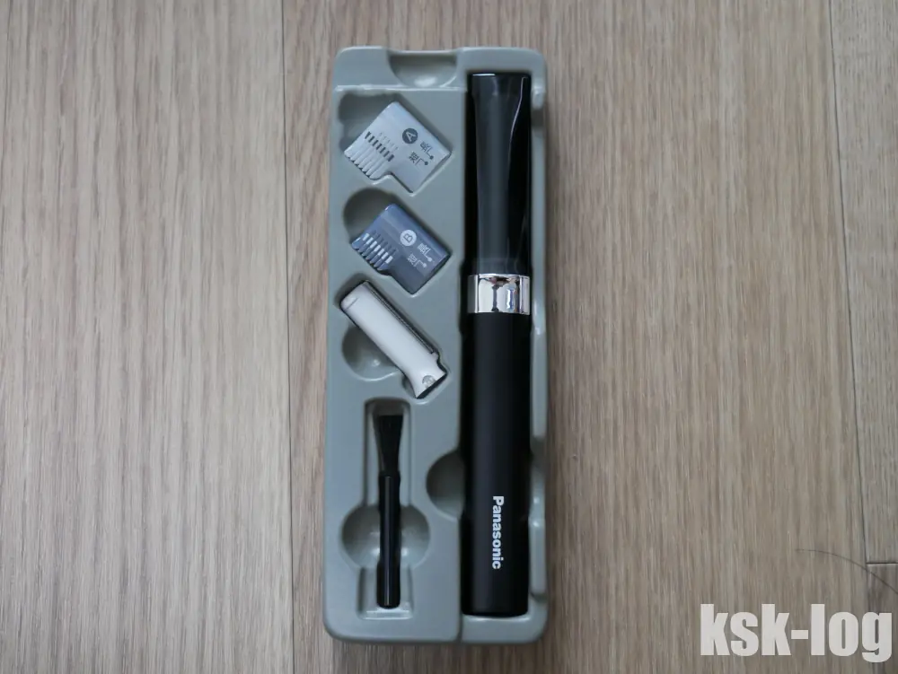 箱を開けると本体のほか、替刃と2種類のコームにブラシが入っています。
