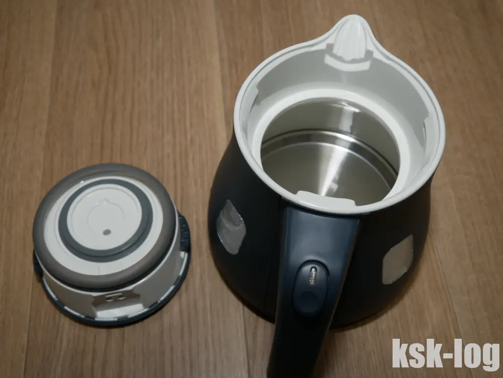 本体はスレートブルーの色になってますが、内側はホワイトのパーツが使われているので純一色ではないです。上部の丸いボタンは注ぎ口ロックボタンで、押されているとロック解除となります。 電源ボタンは下に倒すとOnとなるようですね。