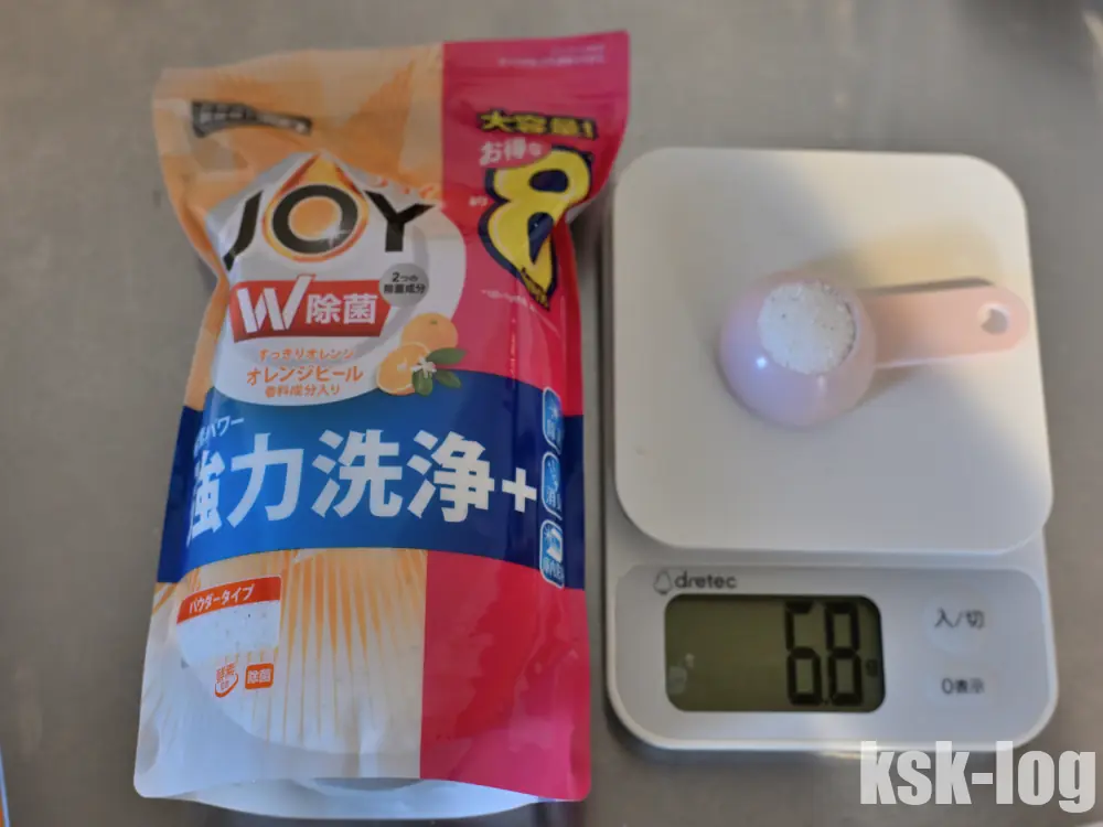 食洗機用洗剤JOY(粉末タイプ)の小さじ一杯の分量は6.8gでした